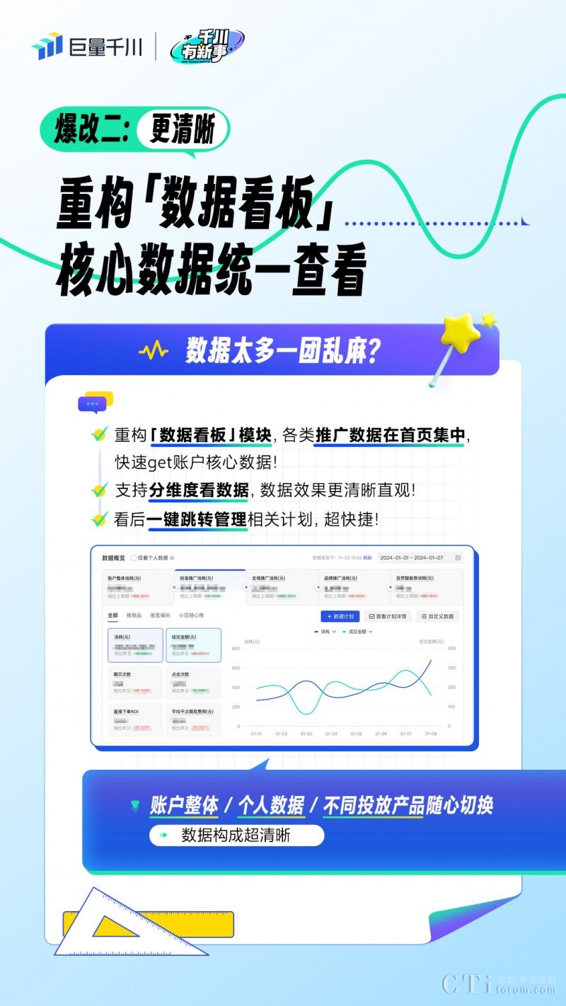 新升級的巨量千川首頁通過重構(gòu)「數(shù)據(jù)看板」,將重要的推廣數(shù)據(jù)集中在首頁,同時還支持分維度查看不同數(shù)據(jù)及趨勢變化,讓商家更清晰地看到數(shù)據(jù)背后的投放、經(jīng)營效果。