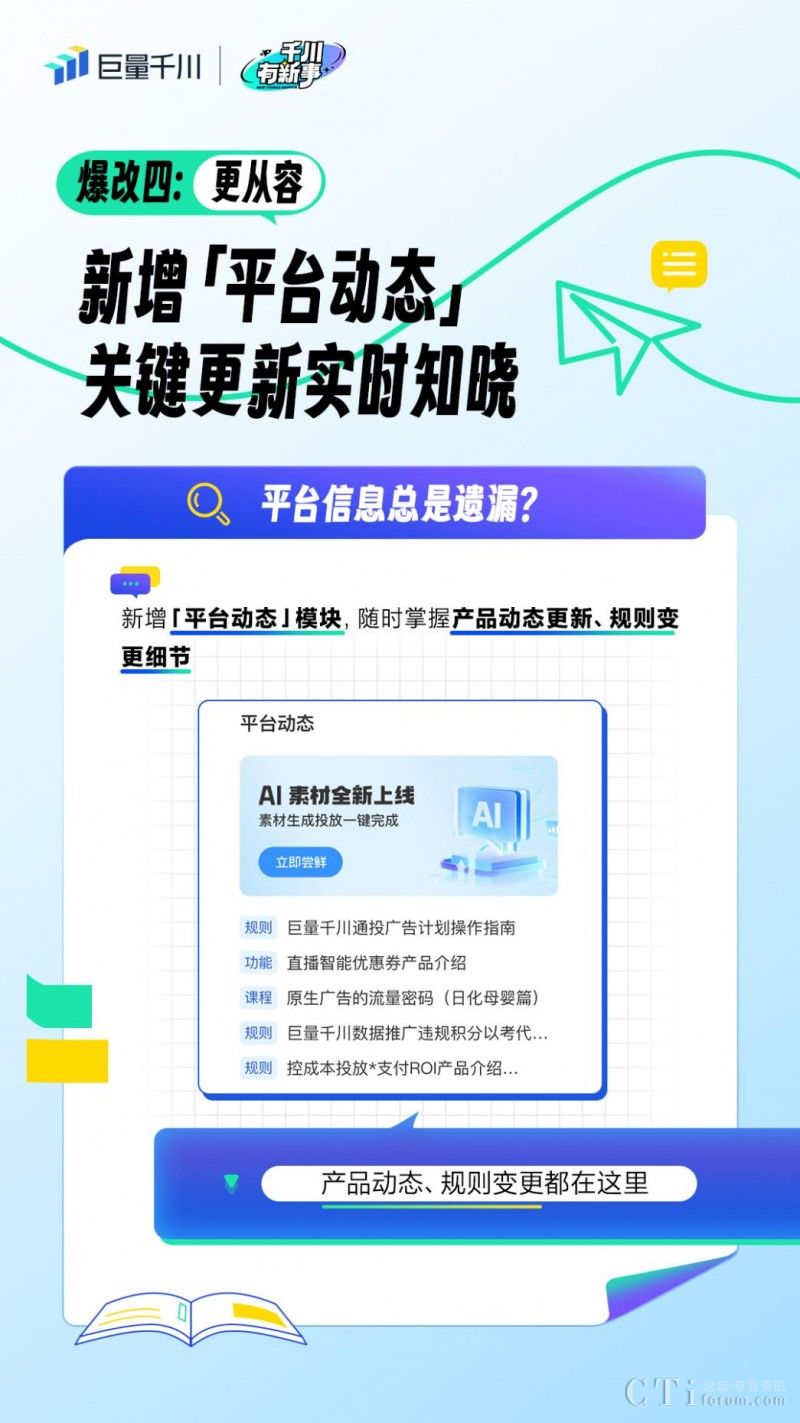 巨量千川首頁升級還增設(shè)了「平臺動態(tài)」模塊,實(shí)時呈現(xiàn)平臺產(chǎn)品更新、規(guī)則變更等信息,讓商家可以及時了解平臺最新動態(tài),把握生意增長機(jī)遇。