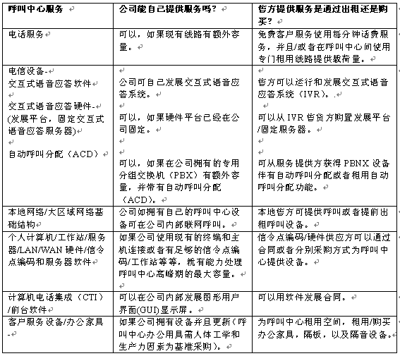 。。一旦決定從事呼叫中心業(yè)務,公司必須確定要從外部售貨方購買的服務與設備的范圍。公司政策和經(jīng)營法則會指示其應遵循什么程序進行這一過程。也可能會是一些合同,它們可以使公司能夠快速地完成這些步驟。