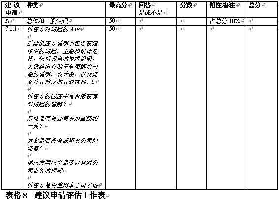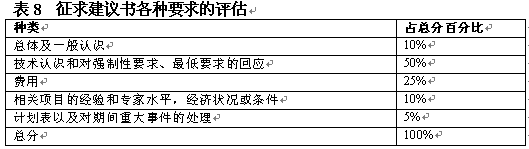 。。在決定了初步要求之后,評估小組應具體地開展評估工作。具體評估的目標是通過給建議書主要方面打分作出評估?梢栽谒愠鼋ㄗh書各方面占總分數(shù)的百分比,如表8中對各方面的總覽。一般在建議書內(nèi)向提供者給出這一信息。