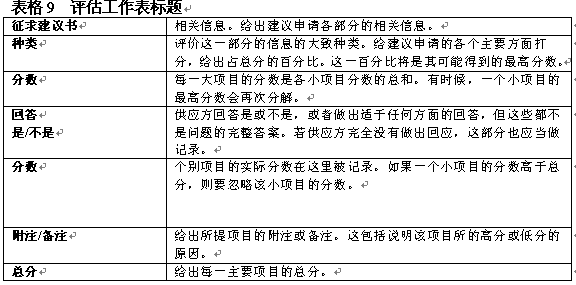 建議申請評估工作表有助于資源選擇工作組客觀地對承包商建議進行評價。這一過程包括在總分基礎上給各個方面評分。表格8舉出了一個具體的評分表表格9包含了對工作表標題的解說。