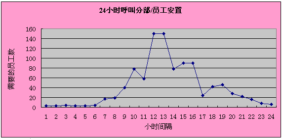 呼叫中心一年中要運(yùn)行365天,也就是說每天需要三次8小時(shí)工作替換。一天中員工需求量會(huì)隨著呼叫量高峰期和低估期而波動(dòng)。下面的圖標(biāo)詳細(xì)說明了平時(shí)可能需要的變化的員工需求。