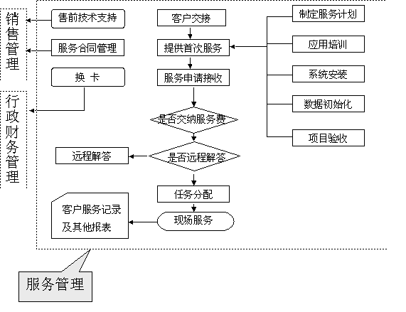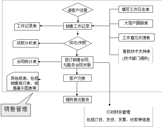 選定適合中小企業(yè)應(yīng)用的CRM軟件 ----啟利CRM ( ChineseCRM.Net ),并由啟利公司負(fù)責(zé)提供實(shí)施服務(wù)。CRM系統(tǒng)的主要模塊包括:市場(chǎng)管理、銷售管理、服務(wù)管理、行政管理,各模塊主要業(yè)務(wù)流程圖如下: