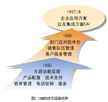 ----二是CRM的技術逐漸走向成熟(見圖1)。1990年左右,CRM方案只是片斷功能的實現(xiàn),到1995年以來、1997/8年以來,逐漸出現(xiàn)了部門級應用軟件包、企業(yè)級應用方案。有些企業(yè)甚至已經開始關心自己原有的ERP系統(tǒng)與正在建設的CRM系統(tǒng)之間的集成問題。