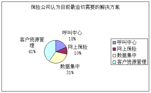 研究發(fā)現(xiàn),保險(xiǎn)公司目前最急需的解決方案是客戶資源管理和數(shù)據(jù)集中。有40.2%的保險(xiǎn)公司認(rèn)為CRM最為迫切或有發(fā)展前景,所占比例最高;其次是數(shù)據(jù)集中,所占比例為31.2%;認(rèn)為呼叫中心最為迫切或有發(fā)展前景的保險(xiǎn)公司比例是18.4%,而對(duì)于網(wǎng)上保險(xiǎn),這個(gè)比率只有10.2%。