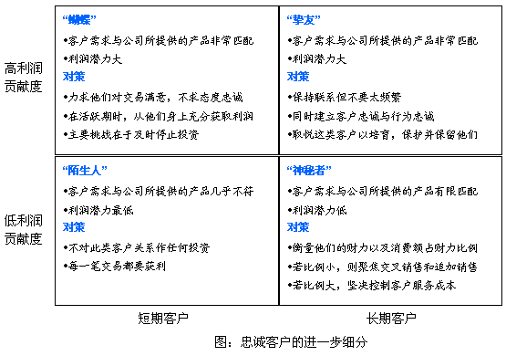 CRM廠商和業(yè)界普遍認(rèn)為:只要贏得了客戶的忠誠,企業(yè)將"財(cái)源滾滾";因此企業(yè)在培養(yǎng)客戶忠誠方面的開支在逐步上升。因?yàn)閺谋砻嫔峡磥,客戶滿意度、客戶忠誠度和客戶保留度越高,客戶利潤貢獻(xiàn)度就大。但事實(shí)并不如他們所愿,《哈佛商業(yè)評(píng)論》最新的論文,研究表明:客戶滿意度、客戶忠誠度與客戶利潤貢獻(xiàn)度的關(guān)聯(lián)程度比預(yù)期的要小得多。企業(yè)應(yīng)當(dāng)對(duì)忠誠客戶再進(jìn)行細(xì)分,然后在更細(xì)化的客戶基礎(chǔ)上對(duì)其進(jìn)行分類管理,并采取相應(yīng)的對(duì)策。在論文中,作者根據(jù)利潤貢獻(xiàn)度大小與客戶的短長期兩個(gè)維度,將忠誠客戶進(jìn)行了深層次細(xì)分。主要分成四類:"蝴蝶"、"摯友"、"陌生人"、"神秘者"。企業(yè)應(yīng)該根據(jù)每一類的情況采取相應(yīng)的對(duì)策。管理那些能使企業(yè)盈利但不忠誠的客戶--"蝴蝶"--的關(guān)鍵是,在他們購物時(shí)盡可能地從他們身上獲利。對(duì)那些既能帶來利潤又忠誠的客戶--"摯友",細(xì)心呵護(hù)他們則更為恰當(dāng)。至于那些忠誠但不能帶來利潤的客戶--"藤壺",你需要做的是確定他們是否有增加消費(fèi)的潛力。最后,對(duì)于"陌生人"--那些既不忠誠又沒有利潤可賺的客戶,答案當(dāng)然很簡(jiǎn)單:早點(diǎn)認(rèn)出他們,不對(duì)他們做任何投資。