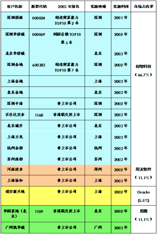 在國務院發(fā)展研究中心企業(yè)研究所、清華大學房地產(chǎn)研究所和搜房研究院共同發(fā)起評比的"中國房地產(chǎn)TOP10"中已經(jīng)有3家企業(yè)導入CRM,它們是:居財富創(chuàng)造能力TOP10第2位的深圳招商;居利潤總額TOP10第5位的深圳華僑城;居財富創(chuàng)造能力TOP10第7位的深圳金地。截止2003年10月底,只有創(chuàng)智科技公司為"中國房地產(chǎn)TOP10"提供了房地產(chǎn)CRM解決方案。