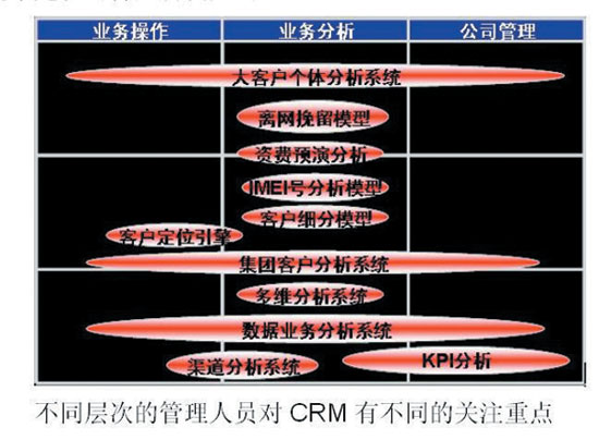 同理,面向大客戶和集團客戶工作的大客戶個體分析系統(tǒng)和集團客戶分析系統(tǒng)因為其面向一個部門的特殊性,所以橫跨了業(yè)務(wù)操作、業(yè)務(wù)分析和管理三個層次。只有將CRM系統(tǒng)的建設(shè)按照模塊化結(jié)構(gòu)化的思路進行才能真正滿足用戶的實際需求和其日常工作與業(yè)務(wù)緊密聯(lián)系起來,使CRM系統(tǒng)發(fā)揮出應(yīng)有的效果。