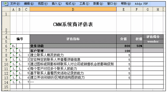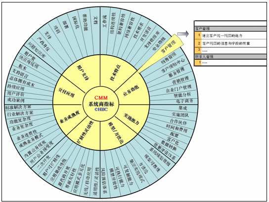 CMM體系中的標(biāo)準(zhǔn)并非在每一次評估中都需要用的,它實(shí)際上是一個滿足大部分CRM評估的標(biāo)準(zhǔn)的合集。所以應(yīng)用者首先要自己或者借助評估顧問來選擇CMM指標(biāo)范圍,確定哪些指標(biāo)參與此次評估。