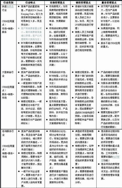 從以上簡(jiǎn)單的分析過(guò)程我們可以看出由于企業(yè)所處行業(yè)特點(diǎn)的不同,導(dǎo)致在市場(chǎng)、銷售和服務(wù)方面對(duì)CRM主要功能需求差別非常大。企業(yè)在實(shí)際選型過(guò)程中,還需要對(duì)行業(yè)再進(jìn)行細(xì)分分析,比如在快速消費(fèi)品中,洗滌用品行業(yè)和牛奶乳業(yè)行業(yè)在客戶服務(wù)的主要需求等方面就有比較大的差別,這些都需要細(xì)致的分析。