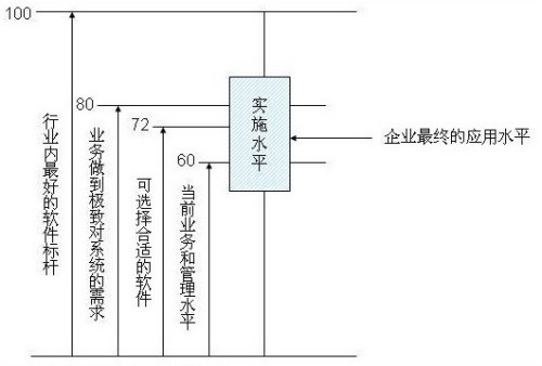 如果用一個(gè)數(shù)量化的概念來(lái)表達(dá)的話,假定行業(yè)內(nèi)最好的軟件是100分,企業(yè)做到極致對(duì)系統(tǒng)的需求可能是80分,當(dāng)然也可能沒有一個(gè)軟件能滿足企業(yè)所有的需求,但從整體上,一個(gè)企業(yè)的主體需求一定在行業(yè)內(nèi)最好的軟件標(biāo)桿之下。而當(dāng)前的業(yè)務(wù)和管理水平一般到不了極致,假設(shè)是60分,那選擇的軟件70-75分一定是合適的,高于當(dāng)前需求,而不要高得太多,最終的實(shí)施水平是一個(gè)區(qū)間,這取決于實(shí)施商的能力和企業(yè)的能力,可能會(huì)低于企業(yè)當(dāng)前業(yè)務(wù)和管理水平,也可能使系統(tǒng)超水平發(fā)揮,而企業(yè)最終的應(yīng)用水平一般就在這個(gè)區(qū)間里游動(dòng)了。這個(gè)模型看起來(lái)很理論化,操作時(shí)需要考慮很多的因素,但是非常有價(jià)值的判斷標(biāo)準(zhǔn)。
