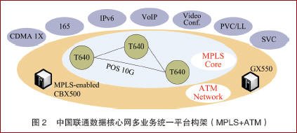 中國聯(lián)通IP電話網的承載網分為核心層和區(qū)域層兩級結構,核心層由北京、上海、廣州、沈陽、武漢、西安和成都7個大區(qū)節(jié)點組成;區(qū)域層按各分公司區(qū)域分布情況,劃分為22個區(qū)域。建網初期,承載網采用ATM+IP/VPN組成IP電話專用傳輸網,確保IP承載層的QoS,網絡性能符合聯(lián)通測試指標。下一階段,中國聯(lián)通數據核心網的技術演進路線方向如圖2所示。網絡將以MPLS+ATM為核心技術,在7大核心節(jié)點建設功能強大的MPLS核心網絡,同時采用2層MPLS技術,實現(xiàn)與ATM設備的透明連接,從而構建一個多協(xié)議、多業(yè)務同時兼顧IPv4/IPv6發(fā)展的先進網絡。中國聯(lián)通的互聯(lián)網、數據專線、IP電話、視頻會議、IPv6網絡、CDMA1X數據通信網等都承載在統(tǒng)一的數據傳送平臺之上。
