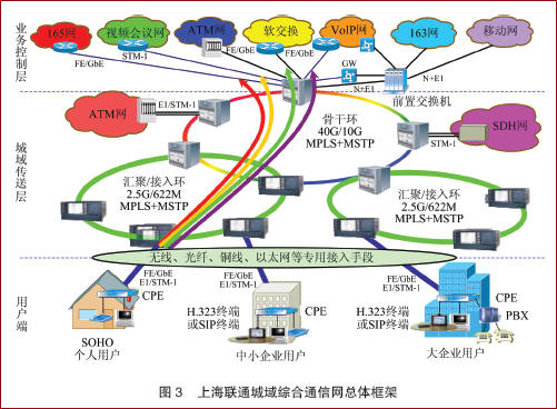 上海聯(lián)通城域網總體發(fā)展思路是,以“NGN為中心、數據MPLS與傳輸MSTP融合并重發(fā)展”。網絡層次結構如圖3所示?紤]到上海聯(lián)通在“最后一公里”接入的實際情況,將骨干層和匯接層的建設與接入層的建設分離,各有側重。骨干層和匯接層統(tǒng)稱為“核心網”,重點考慮業(yè)務的傳送能力;在接入層和用戶端,重點考慮UniOne綜合業(yè)務的接入,盡量做到設備提供商、系統(tǒng)集成商、客戶端應用軟件開發(fā)商三者的統(tǒng)一。