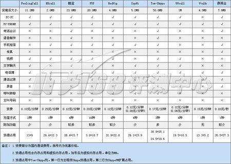 單獨(dú)安裝每一個(gè)軟件到測(cè)試系統(tǒng)中,查看文件大小。注冊(cè)帳號(hào),順序測(cè)試軟件的每項(xiàng)功能,包括語音、視頻、文本及附加功能;在效果測(cè)試部分,測(cè)試每一個(gè)軟件PC-PHONE的語音效果,分別撥打固定電話及移動(dòng)電話,測(cè)試兩端的語音效果。性能測(cè)試部分為記錄每款軟件在運(yùn)行時(shí)的系統(tǒng)資源占用情況,包括內(nèi)存使用和虛擬內(nèi)存大小兩部分。