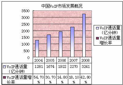 在互聯(lián)網(wǎng)應(yīng)用尤其是VoIP的沖擊下,電信產(chǎn)業(yè)鏈已經(jīng)發(fā)生了很大的變化。電信行業(yè)的縱向壟斷被打破,設(shè)備制造商、軟件提供商在產(chǎn)業(yè)鏈中可以直接向終端用戶提供服務(wù)。目前,中國移動、中國電信、中國網(wǎng)通等都先后建設(shè)了覆蓋全國的商用長途軟交換網(wǎng)網(wǎng)絡(luò),逐步將話音業(yè)務(wù)向VoIP遷移,并可為大客戶提供全國性業(yè)務(wù),如視頻會議、廣域Centrex等。圖1 VoIP市場發(fā)展概況