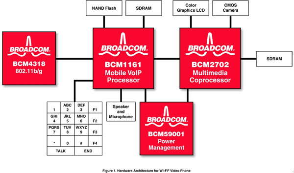 該方法的一個(gè)例子如圖1所示。該方案支持接入到本地?zé)o線網(wǎng)絡(luò)的Wi-Fi 接口上的全雙工語音和視頻,它已經(jīng)有了成功的實(shí)現(xiàn)案例,并計(jì)劃用于一款新型的消費(fèi)產(chǎn)品設(shè)計(jì)。所有高級的呼叫建立和管理、音視頻同步以及應(yīng)用層都在一片BCM1161 VoIP器件上運(yùn)行。為實(shí)現(xiàn)這些功能采用了一片嵌入式通用ARM926E RISC CPU,還有一片嵌入式DSP用于音視頻編解碼和回波消除。利用一個(gè)BCM4318E 802.11b/g Wi-Fi無線網(wǎng)絡(luò)接口,BCM1161提供了為實(shí)現(xiàn)一個(gè)具有成本效益的Wi-Fi手機(jī)的語音所需的全部功能。