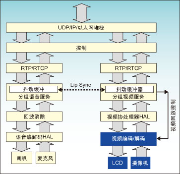 盡管同步并不是一個(gè)很大的運(yùn)算負(fù)擔(dān),但同步算法和實(shí)現(xiàn),包括抖動(dòng)緩沖管理,都需要特別小心方可達(dá)到預(yù)期的結(jié)果。有效的方法是,將該處理與總的系統(tǒng)控制和編解碼處理管理緊密地協(xié)調(diào)。一種最好的方案是將同步處理放在實(shí)現(xiàn)更高級功能的系統(tǒng)通用主CPU上來實(shí)現(xiàn)。