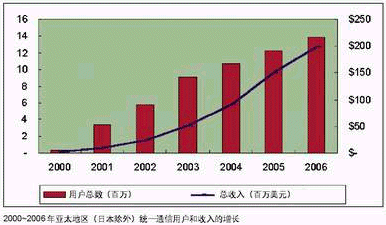 據(jù)IDC預(yù)測(cè),亞太地區(qū)(不包括日本)統(tǒng)一通信用戶數(shù)量將從2000年的32萬增長到2006年的1385萬。盡管起點(diǎn)較低,收入將從2000年的119萬美元增長到2006年的1.987億美元。這個(gè)增長大部分受中國和澳大利亞推動(dòng),在這兩個(gè)國家,價(jià)格和市場(chǎng)由上層大電信公司決定。