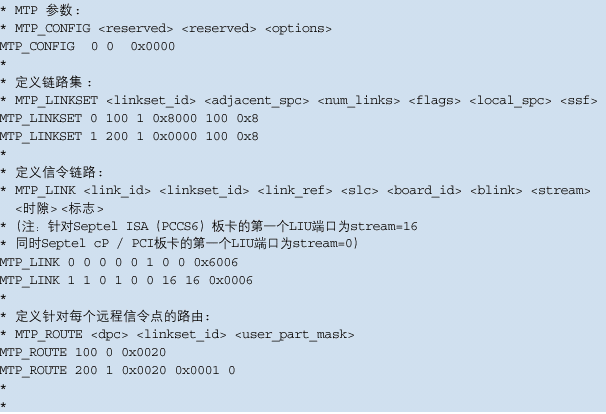 system.txt文件必須也包括主機(jī)上運(yùn)行的所有本地SS7協(xié)議,如ISUP、TUP、SCCP或TCAP(如果有),以及應(yīng)用程序任務(wù)、配置工具(如s7_mgt)和調(diào)試工具的LOCAL定義。這里也應(yīng)該通過FORK_PROCESS語句來啟動(dòng)相應(yīng)的驅(qū)動(dòng)和支持任務(wù),在相應(yīng)的程序員手冊(cè)中有詳細(xì)描述。
