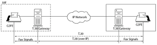 注意: T.38協(xié)議本身直接在收發(fā)網(wǎng)關(guān)之間運(yùn)行。呼叫建立、電傳設(shè)備和網(wǎng)關(guān)之間其他通信或者電傳設(shè)備之間或者其他設(shè)備之間的通信不在T.38協(xié)議范圍內(nèi)。